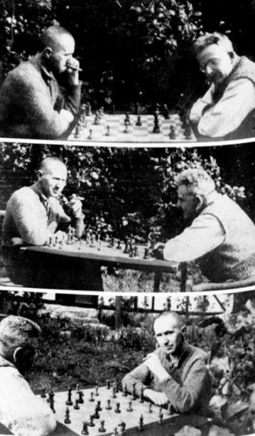 Hay tres fotografías en la que Brecht y Walter Benjamín —el mejor exégeta de la obra brechtiana— juegan al ajedrez. El encuentro entre ambos ocurrió en Svendborg, en 1934, y está descrito por Benjamin en sus Conversaciones con Brecht. Dos de las imágenes muestran a los dos “oponentes” inmersos por completo en la partida —que según especialistas se desarrolló en las complicaciones tácticas de una Defensa francesa—, planeando/imaginando sus destinos en los entresijos de las sesenta y cuatro casillas, exiliados ambos del afuera, del entorno; esto es, habitantes de otras comarcas e ideologías lejanas de este mundo. La tercera foto sí muestra a Brecht mirando el lente de la cámara, es decir, mirándonos. Pero cuidado, nos está mirando (mirada fugaz que el lente eternizó) desde un esencial extrañamiento, desde su radical exilio.